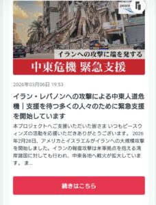 2026/03/06 普段はこうした内容の拡散はSNSに限っていますが、少しでも命を救える手だてになればー 緊急支援|イランへの攻撃に端を発する中東危機に援助を(ピースウィンズ・ジャパン 2026/03/05 公開) – クラウドファンディング READYFOR https://share.google/3zzXhDqVpQuSnODfv 動いてくださる方々にも危険が及びませんよう、くれぐれもご無理ありませんように READYFOR クラウドファンディング ピースウィンズ・ジャパン 中東危機